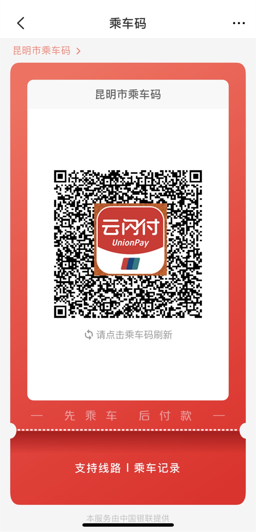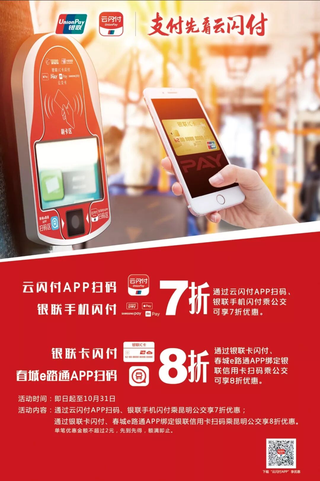通过银联手机闪付、云闪付APP扫码乘昆明公交享7折优惠(单笔优惠金额不超过2元,先到先得,满额即止)