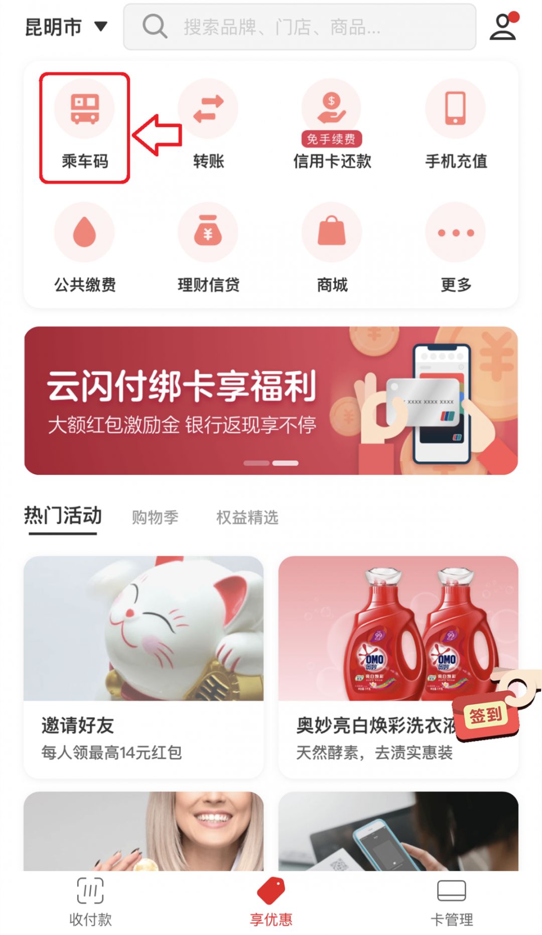 第一步 打开云闪付APP,进入“享优惠”界面,点击“乘车码”。 |