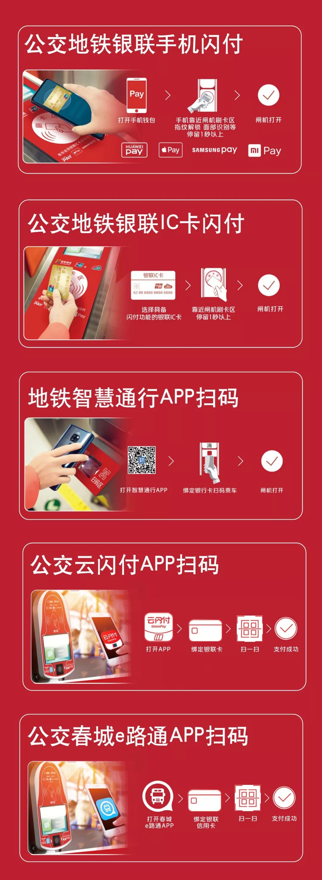 3月31日开始,昆明地铁全部运营线路共计57个车站1300多个闸机全部开通受理银联闪付,使用具有银联手机闪付功能的智能手机(如Huawei Pay、Apple Pay等),或者境内银行发行的62开头银联IC卡(包括信用卡及借记卡),以及各种具有银联闪付功能的可穿戴设备,就可以“一闪即付”,轻松过闸乘坐地铁。