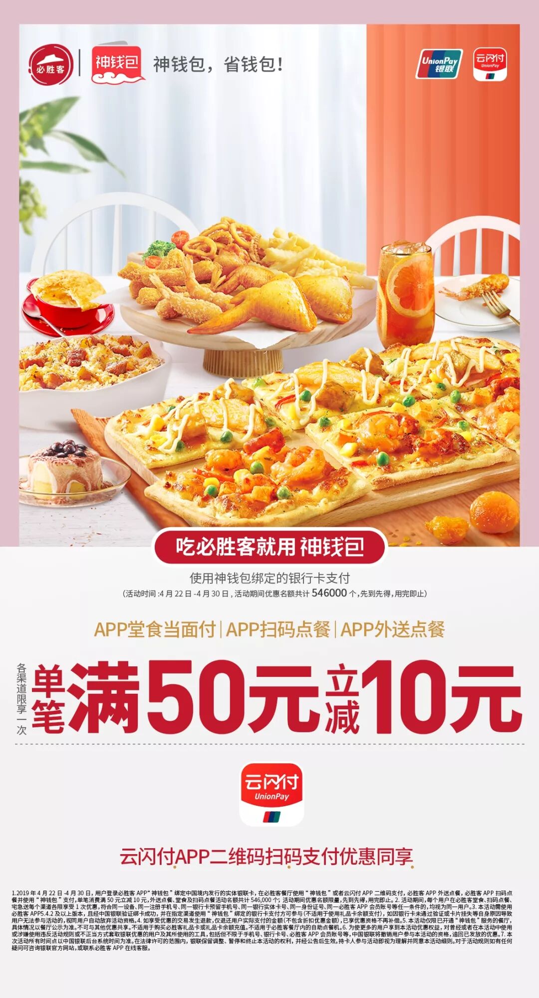 6. 本次活动所有时间点以中国银联后台系统时间为准。在法律许可的范围内,活动主办方保留调整、暂停和终止本活动的权利,并经公告后生效。持卡人参与活动即视为理解并同意本活动细则。对于活动规则如有任何疑问可咨询银联或联系必胜客APP在线客服。