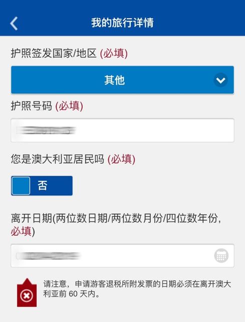 步骤2)里,你首先需在“我的旅行详情”里填写护照号和离境时间。这里要注意了,你的退税所附发票日期必须在离开澳大利亚前60天内。如果是之前来过澳洲但忘了退税想把发票攒到这波一起退,记得时间不要过期哦~