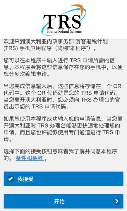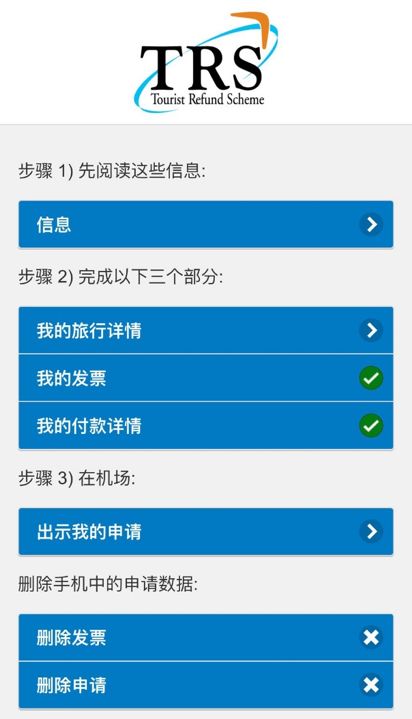 那具体该怎么退呢?推荐你下载个TRS app,然后按照步骤一步步填下来就行了,还有中文翻译(我是在澳洲当地下载的,一下下来就是中文版,可能与手机设置有关?)并且能轻松退税到银联信用卡,可以说操作相当傻瓜了。这里给大家简单展示一下: