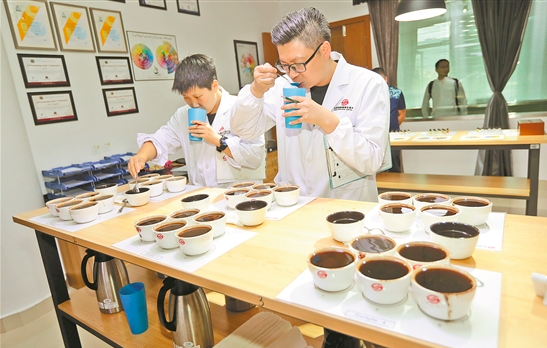 经过3年多的建设,位于普洱市思茅区的云南(国际)咖啡交易中心已建立起亚洲最专业的质检中心、杯品中心和培训中心,采用现代电子信息技术提供的信息、展示、拍卖、结算、仓储、物流融资等服务,实现了“一站式”交易配套服务。中心在册种植商会员1000余家,覆盖云南主要咖啡主产区和老挝、越南、缅甸、泰国等国家;在册采购商会员2000余家,涉及欧美、日韩、中东及国内主要城市的咖啡生产商、贸易商和连锁咖啡店。通过在云南咖啡原产地打造“以咖啡交易为核心,以金融服务为支撑,以产业上下游为重点,实现咖啡产业一二三产融合发展为目标”的全产业链服务平台,交易中心现已成为面向内地、港澳台地区、亚洲及欧美消费市场的主要交易平台和全球咖啡产区产品进入中国市场的重要渠道。( 记者 杨峥 摄影报道)