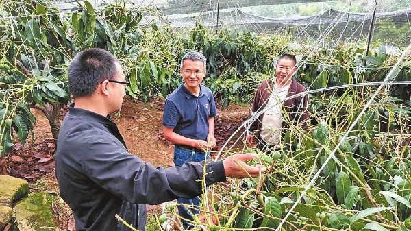 在中心镇田坪村试验观测点,研究员们遇到了正在精心照料果园的果农熊洪高。近年来,熊洪高通过技术手段推迟芒果上市时间,取得了可观的经济效益。“我们通过在果树上方覆盖遮阳网、调整光照时长和温度,推迟芒果上市时间。与其他种植户一年一采摘不同,我家果园采取两年一收的方式,前年收入150万元,今年预计产量25万余公斤。”熊洪高说,期待马小卫团队早日研究出更加成熟的技术,助力果农再增收。
