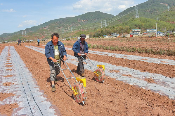 在品种选择上,会泽县农技中心引导、推荐群众使用“滇豆7号”“云黄13”“云黄12”等丰产稳产、耐阴、抗倒、耐逆、综合性状良好的大豆品种;使用株高较矮,早熟、耐密、高产、生育期短、抗病性强的“川单99”“靖单17”“珍甜8号”等玉米品种。在播种过程中,鼓励群众使用大豆滚筒播种机和玉米播种机机械化播种,提高效率的同时还能让播种更均匀。