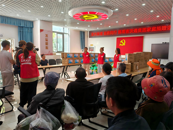 集中发放,党群连心。在社区会议室搭建的活动场地里,大家共聚一堂,畅谈家常、亲切互动。工作人员中发放慰问礼品,现场氛围和谐而温馨。