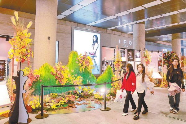 近日,以“老昆明八景”为创作灵感的大型艺术装置亮相昆明顺城购物中心。滇池月夜、云津夜市、螺峰叠翠、龙泉古梅、商山樵唱、官渡渔灯、灞桥烟柳、蚩山倒影8个承载着昆明集体记忆的文化意象,通过沉浸式场景化手法转化为可触可感的现代艺术表达。图为“螺峰叠翠”置景吸引市民游客。(记者 胡妤雅 摄)