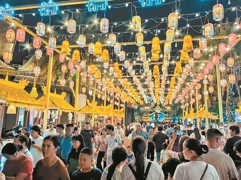 与此同时,各特色点位的活动也持续吸引游客。姐告边境贸易区内,“2025年云南(德宏)边境贸易商品交易会”人气爆棚,国际免税购物狂欢让游客尽享消费乐趣,咖啡文化展示品鉴带来舌尖上的惊喜;“一寨两国”景区的中缅特色歌舞表演轮番上演,尽显边境村寨的独特风情;瑞丽古城的花车巡游华丽吸睛,“王朝盛景 边城夜秀”每晚准时登场,点亮边城夜空;长街上的中缅美食摊点烟火气十足,甩粑粑、油面等特色小吃香气四溢,引得游客纷纷驻足品尝,感受地道的边境风味。