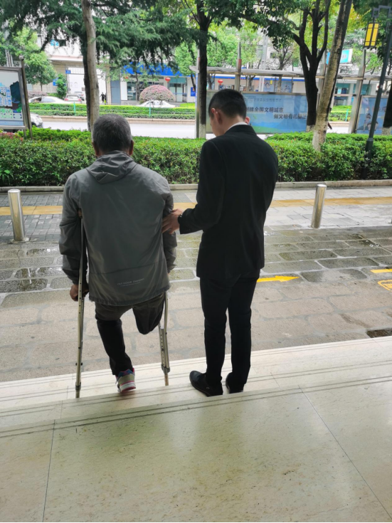 办理结束后,正值雨天,营业员担心地面湿滑老人行走不便,便主动搀扶着他缓缓走下台阶,一路护送至厅外,用实际行动传递“心级服务”的温度与关怀。