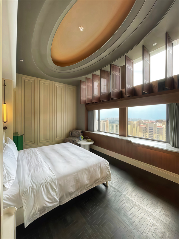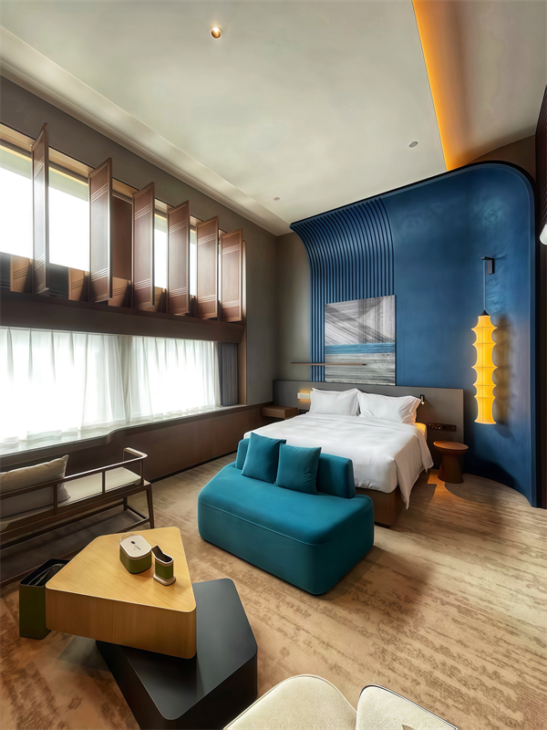 据悉,酒店整体设计由北京七十二创设计首席设计师张振科执笔,以中华文化为根基,西式美学为表达,用独具一格的“无主义风格”奏响一曲彩云之南的瑰丽乐章。室内空间巧妙运用云南孔雀配色体系,孔雀羽毛纹理与少数民族彩色图案点缀其间。在屏风或艺术玻璃上,宾客能发现如孔雀翎眼般的纹理,它们以抽象、渐变的方式呈现,如同神鸟飞过,在空间中遗落下斑驳的光影,形成现代与传统的美学对话。