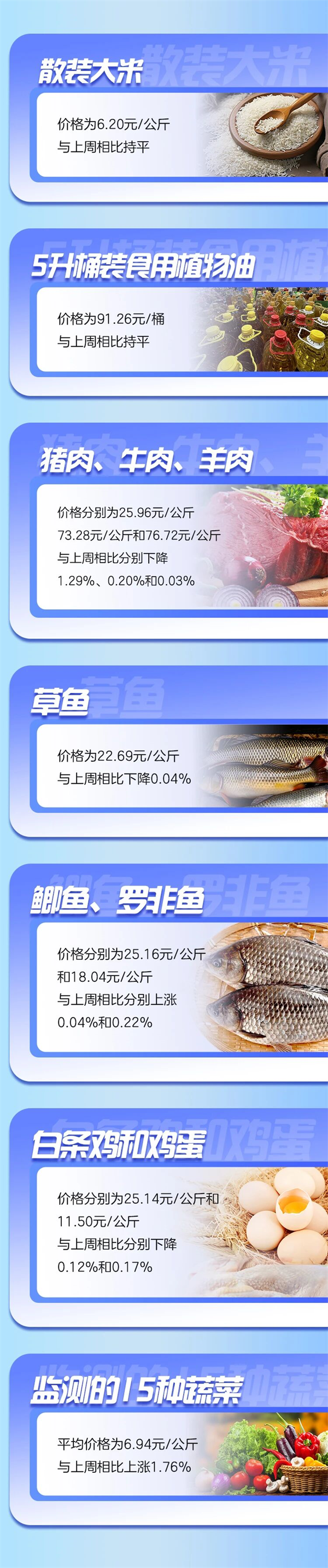 从云南省发展和改革委员会重要民生商品零售价格监测数据看,与上周相比,本周全省猪肉价格(全省平均价格,下同)小幅下降,蔬菜价格小幅上涨,其他粮、油、肉、蛋价格总体平稳。