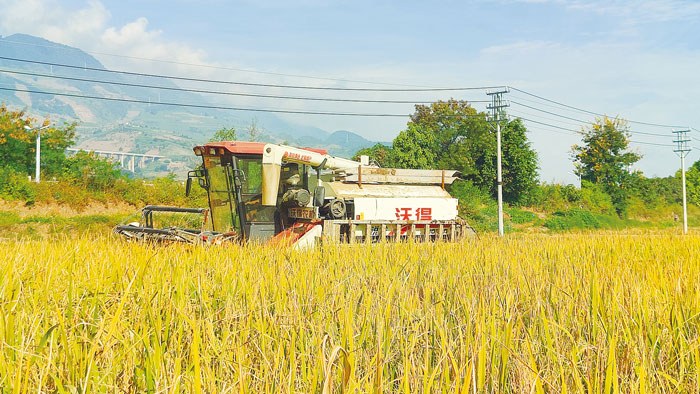 在永康镇的晚稻田间,机械化收割有序推进,收割机将沉甸甸的稻穗整齐卷入,迅速完成脱粒、清选等工序,金黄的稻谷从出粮口倾泻而下,很快装满粮袋和运粮车。农民弯腰拾穗、协力搬运,脸上写满笑意,指尖沾满稻香。