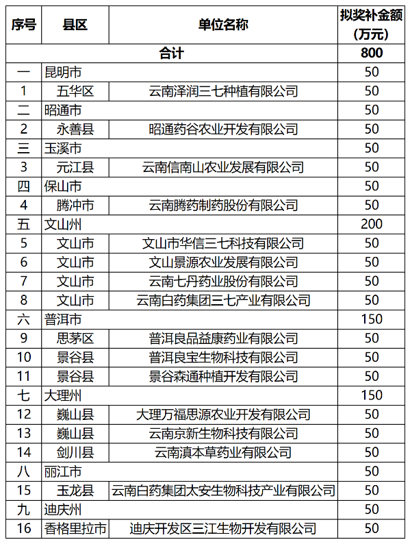 根据有关要求,经县(市、区)、州(市)农业农村部门(中药材主管部门)和财政部门会同相关部门逐级审核,云南省农业农村厅、云南省财政厅依次复核,确定2025年中药材GAP基地评价奖补资金拟奖补项目名单,现予以公示,公示期为2025年11月24日—11月28日。公示期间如有异议,请书面反馈省农业农村厅。如无异议,公示结束后将按名单给予兑付。