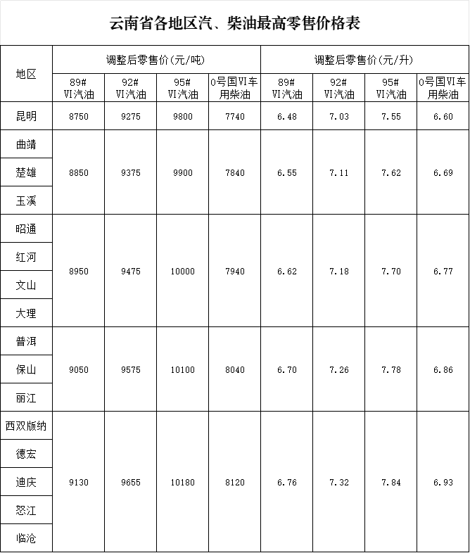 据国家发展改革委网站消息,自2025年11月24日24时起,国内汽、柴油(标准品)价格每吨分别降低70元、65元,调整后云南省各地区的汽、柴油最高零售价格见附表↓↓