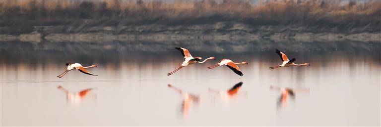 11月23日,火烈鸟在山西省运城湿地自然保护区展翅飞翔。近年来,该市推进“退盐还湖”、湿地绿化、系统性生态补水等修复工程,生态环境持续向好。闫 鑫摄(中经视觉)
