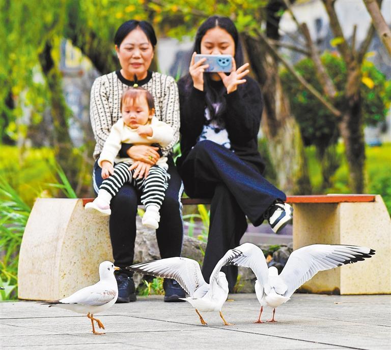 10月30日,贵州省仁怀市楠竹林公园,市民在观赏红嘴鸥。 陈 勇摄(中经视觉)