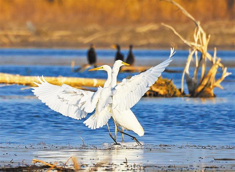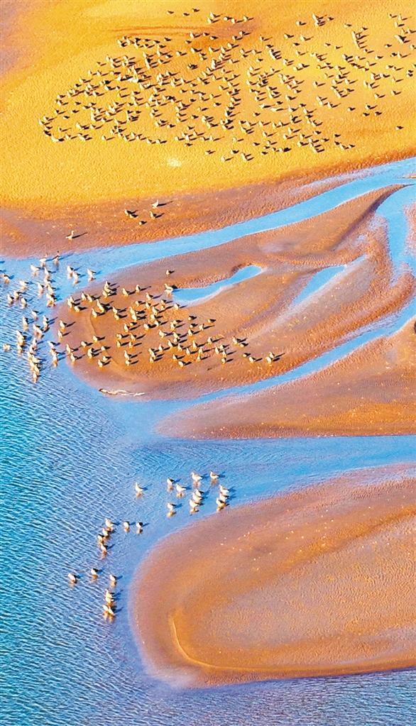 10月30日,新疆维吾尔自治区巴音郭楞蒙古自治州博湖县博斯腾湖,候鸟在觅食嬉戏。该湖是我国最大的内陆淡水湖,在寒冬也能为候鸟提供充足食物与安全栖息空间。