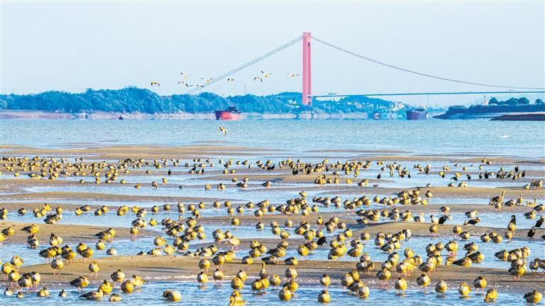 11月20日,长江湖北黄石段,成群候鸟在江边滩涂上觅食。 周 巍摄(中经视觉)