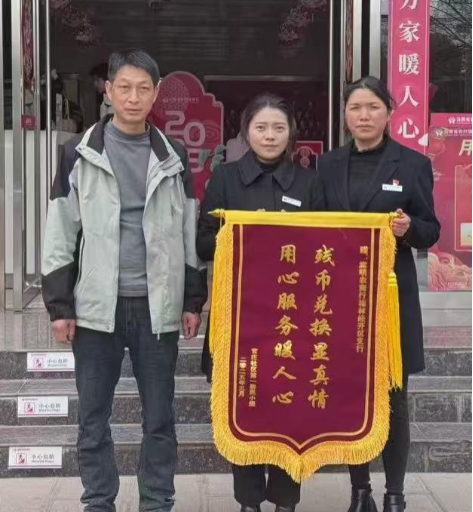 柜员们的专业与敬业,深深感动了老人和周边村民。为表达感谢,村委会特意送来一面写有“残币兑换显真情,用心服务暖人心”的锦旗。锦旗无言,却道尽了农信人的初心,这不仅是一次普通的残币兑换服务,更是全行员工团结协作、为民服务的生动缩影,彰显了嵩明农商行员工高度的职业素养与真诚的服务情怀。