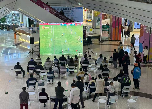 悦云天地商圈则化身沉浸式观赛乐园,成为春城球迷的又一观赛好去处。户外巨型LED屏实时转播赛事盛况,商场中庭贴心摆放着休息座椅,电视屏同步放送赛场精彩,全方位满足观赛需求,让没能抢到门票的球迷也能感受滇超赛场的热烈氛围与足球魅力。