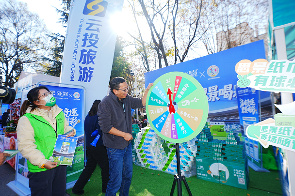 云投旅游展位前的投圈趣味游戏人气爆棚,球迷们摩拳擦掌、跃跃欲试,套中1个即可收获基诺山寨明信片,套中2个能拿到精致的野象谷徽章,连中3个更可获得如哩金湾花园食堂50元代金券。云投林纸展台前的幸运转盘同样热度不减,市民扫码即可参与抽奖,不同的“思景”纸品奖励让现场快乐加倍。展区内精心设计的“画中游”集章互动活动广受欢迎,参与者通过主题涂鸦、打卡拍照、趣味游戏等体验,即可兑换云投旅游旗下景区的定制纪念品,让云南文旅形象更加可触可感。