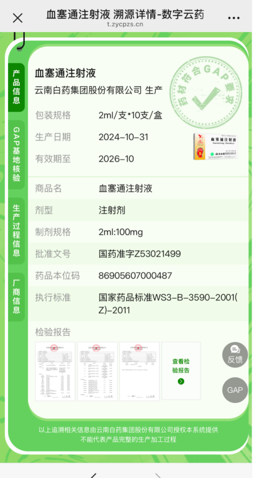 以血塞通注射液为例,质量管理延伸到了中药材种植源头。云南白药联动云南省“链上慧眼监管平台”,构建了从中成药种植信息、生产工艺参数到制剂检测结果全链条数据可追溯的质量管理体系,实现了中成药从种植到提取再到制剂的数字化贯通,为药品安全筑起了一道坚实的防线。
