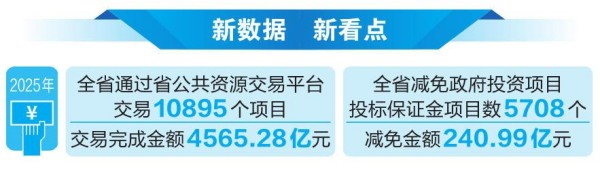 与此同时,我省大力推行保险(保函)替代现金缴纳投标保证金。2025年,全省减免政府投资项目投标保证金项目数5708个,减免金额240.99亿元;保险(保函)共服务全省4238个项目,为投标企业减少资金占用106.94亿元,有效降低企业交易成本,进一步激发市场活力。(记者 段晓瑞)