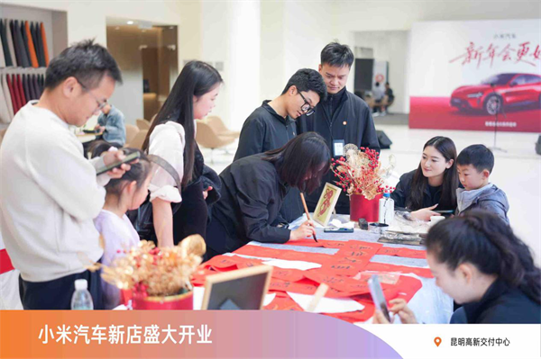 当天还举办了精彩的主题活动——赛道模拟器体验同步开启,新春写对联活动趣味上线,期间还有民谣歌手表演与冷餐茶歇,营造了轻松愉悦的购车氛围,客户全方位感受到了小米汽车的澎湃性能与智能体验。