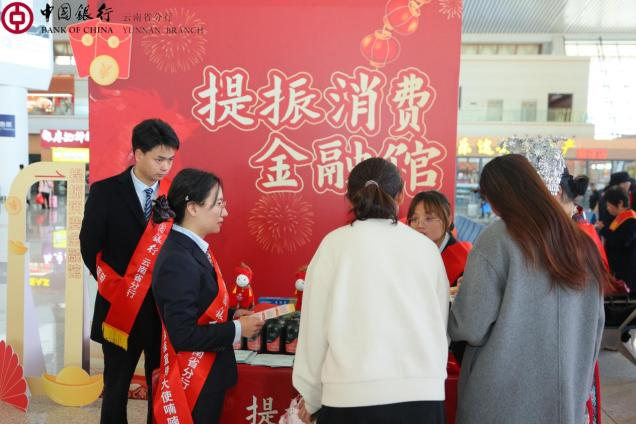 活动当天,昆明南站候车厅变身融合年节氛围与金融智慧的特色空间。由中国银行云南省分行打造的“消费当先·幸福加‘马’”主展区,设立了“消保知识套圈”“提振消费金融馆”“反诈预警中心”“跨境金融服务站”四大功能板块,为旅客提供一站式的金融咨询与金融教育宣传服务。书法家现场书写的金融安全春联,成为受欢迎的“文化年货”;“消保知识套圈”游戏让旅客在趣味互动中掌握常见反诈手段等实用技能。