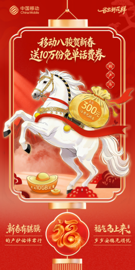新春有骐骥,福气马上来!中国移动APP送“福气”了。用户进入中国移动APP,参加“移动八骏贺新春,送10万份免单话费券”移动年度报告,即有机会抽取“月费免单”,让你新年开局就省钱!