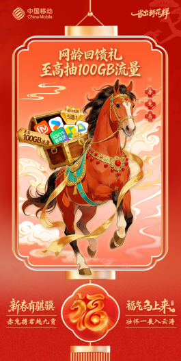 新春宅家追春晚、走亲访友发拜年视频,最怕流量告急?别慌!新春有骐骥,福气马上来!进入中国移动APP搜索“网龄回馈礼”,多重流量、权益好礼已备好,为新年加满福气,帮你轻松告别流量使用焦虑!