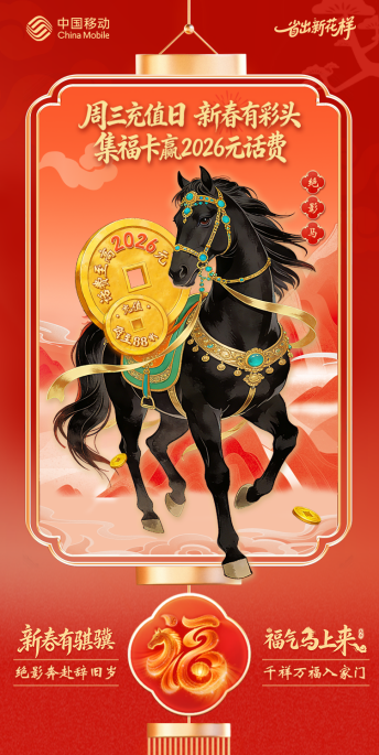 辞旧岁,迎新春!家家户户盼福气,中国移动APP早已备好惊喜满满的厚礼——“移动八骏贺新春,送10万份免单话费券”移动年度报告、骏惠爱购礼、网龄回馈礼、周三充值日、签到有礼,一站聚齐多重福利。上中国移动APP,立马解锁流量、话费、购物等新春惊喜,欢欢喜喜过大年,天天都能“省出新花样”。