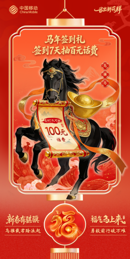 新春有骐骥,福气马上来!锁定中国移动APP,天天有惊喜!进入中国移动APP首页“签到有礼”页面,完成签到有机会得话费或流量福利,累计签到7次就有机会抽取100元话费,做任务攒心愿金可兑换至高10元话费,让新春的实惠与福气相伴!