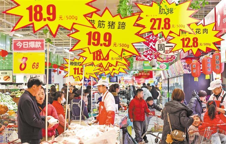 2月15日,甘肃省兰州市城关区一大型商超,市民在选购生鲜食品。为保障春节市场供应,各地加大货源储备,确保粮油、果蔬、肉类等量足价稳,节日市场红火有序。