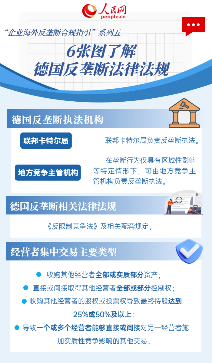 近年来,我国企业国际化进程加速,越来越多企业“走出去”参与国际竞争。针对企业比较关心的海外反垄断合规问题,人民网联合市场监管总局反垄断二司特推出“企业海外反垄断合规指引”系列图解,按国别市场分类带您了解境外反垄断法律制度,为广大企业经营者提供参考。