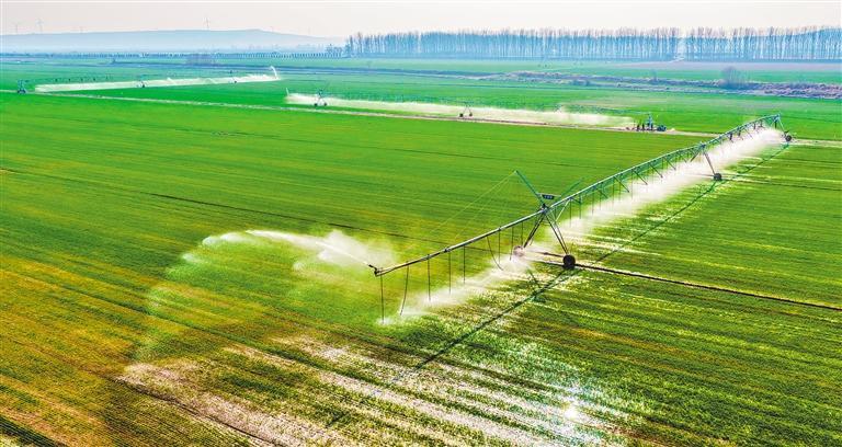 3月11日,山西省运城市芮城县黄汾百万亩粮食优质高产高效示范基地远鹏智慧农场,自走式水肥一体机为小麦实施春浇作业。金玉敏摄(中经视觉)