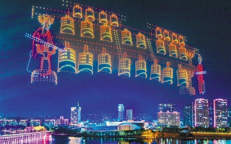 2月17日,随州市在白云湖沿岸举办无人机烟花秀,4000架无人机编队呈现“编钟舞乐”等随州特色文化图案。韩起璞摄(中经视觉)