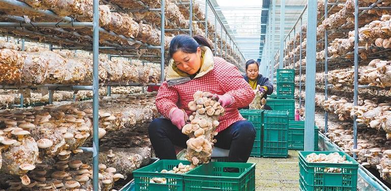 随州市随县吉祥寺村村民在采收香菇。随州有“中国香菇之乡”的称号,全国平均每出口5朵香菇,就有1朵产自随州(摄于2023年11月)。(随县融媒体中心供图)