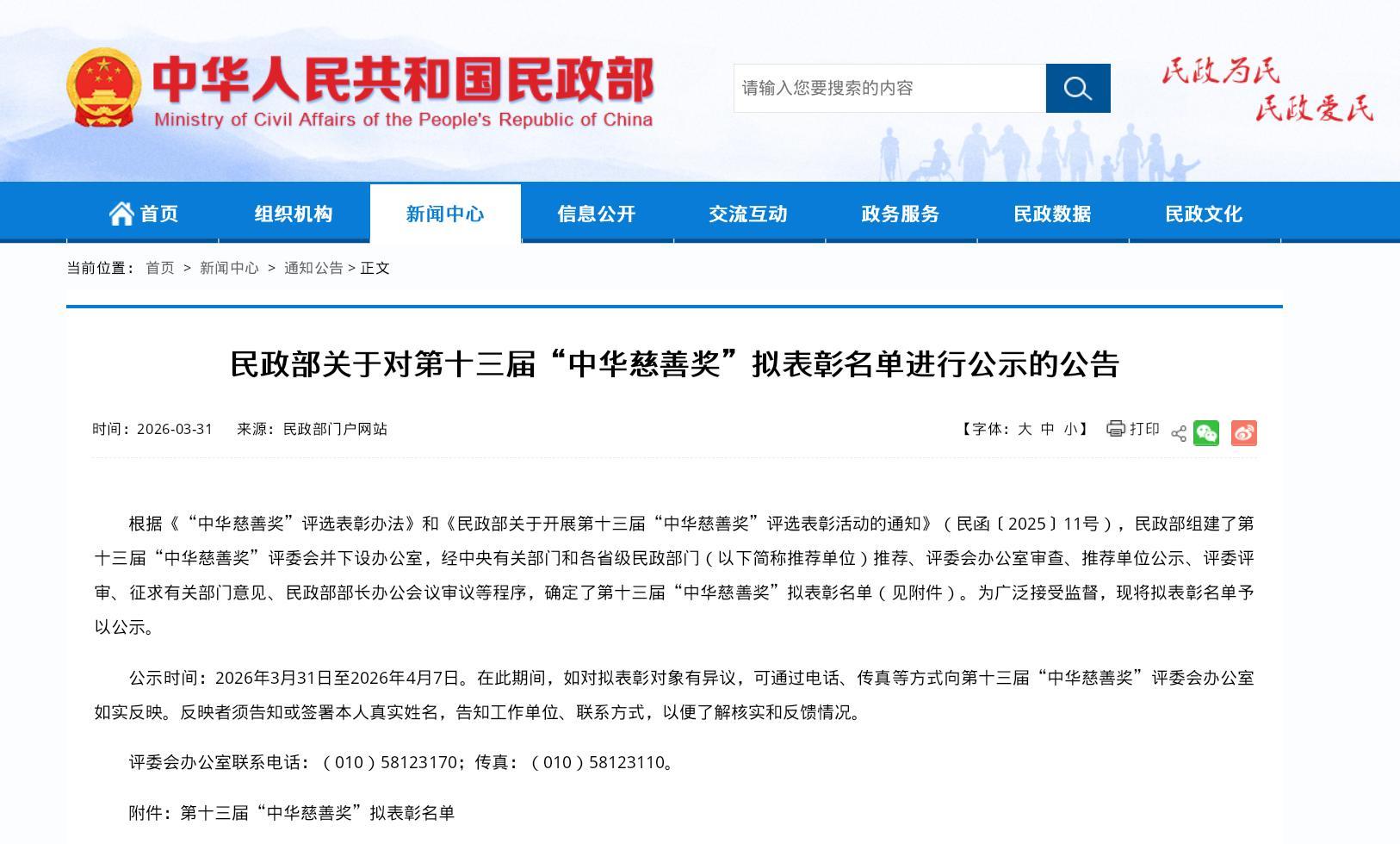 据了解,公示时间为2026年3月31日至2026年4月7日。在此期间,如对拟表彰对象有异议,可通过电话、传真等方式向第十三届“中华慈善奖”评委会办公室如实反映。反映者须告知或签署本人真实姓名,告知工作单位、联系方式,以便了解核实和反馈情况。(经济日报记者 敖蓉)