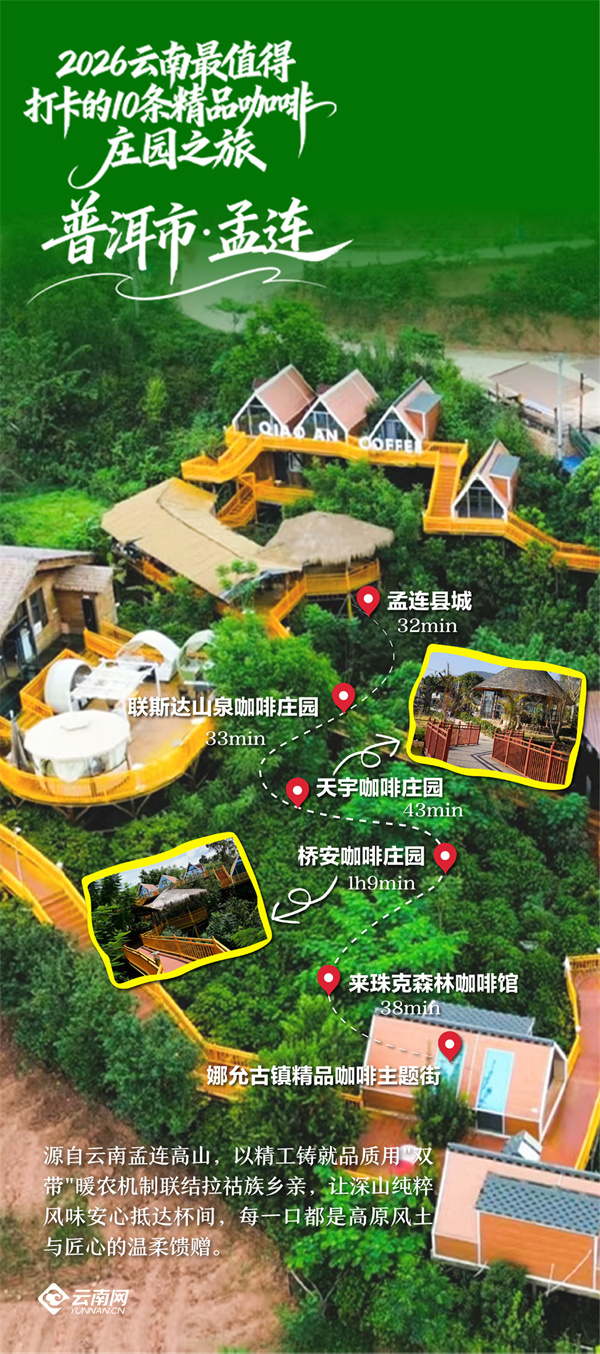 近日,“咖位云南”主题活动分享会上,“2026云南最值得打卡的10条精品咖啡庄园之旅”线路发布。普洱市孟连傣族拉祜族佤族自治县以云海为幕、古城为伴,为游客呈现一条串联高山秘境、森林咖啡馆与土司记忆的醇香漫游之路,让人忍不住想立刻钻进那片翻涌的云海里。