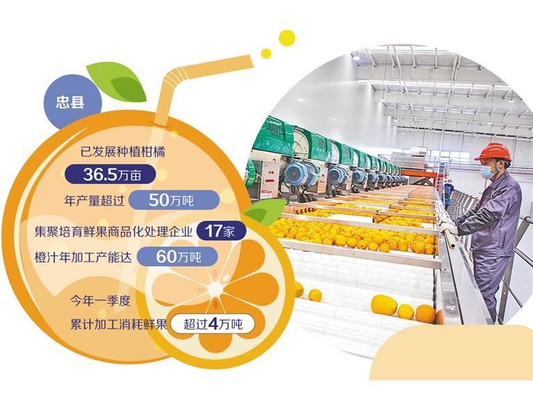 近年来,忠县以建设“橙汁之都”为抓手,通过“龙头引领+配套跟进+集群发展”模式,引进了一批橙汁加工企业,补齐柑橘加工短板,构建起从良种培育、规模种植到精深加工、皮渣资源化利用的全链条产业体系。
