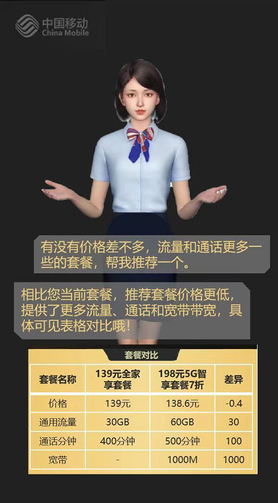 “套餐变更是10086服务热门业务,过去客户来电要求改套餐时,只能全量转接人工服务。”如今,运用大数据算法主动预测客户套餐变更需求,由“小贝”根据客户历史消费、客户特征预判后推荐适配套餐保障客户套餐推荐质量,让每一个客户都能用上“合适又实惠”的移动套餐。