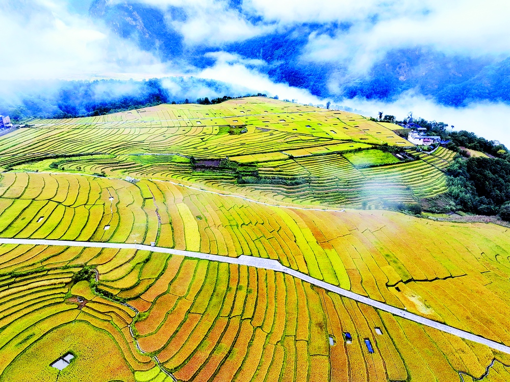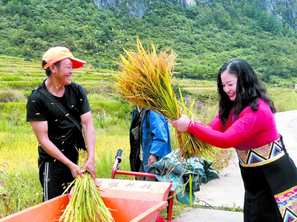 稻田上,满目金黄,稻香四溢,沉甸甸的稻穗随风摇曳,泛起层层金色稻浪;果园里,柚子、百香果等沉甸甸的果实缀满枝头,清甜果香溢满果园;坡地上,山区农民沐浴着金色秋光,抢收玉米,确保颗粒归仓……一幅幅壮美的丰收画卷正在峡谷大地徐徐展开。