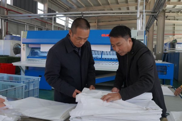 在楚雄康彝清馨洗涤服务有限公司的生产车间内,机器运转有序。高新区投资促进服务中心副主任彭朝聪与公司总经理高学龙边走边聊,不时停下查看生产细节。