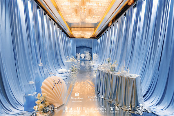 步入现场,蓝白交织的主色调瞬间将人带入静谧的海岛秘境。据了解,本次婚礼秀的舞台设计以“岛屿”为核心,高耸的花艺装置如同海中矗立的礁石,搭配垂坠的水晶串饰,在灯光下闪烁着细碎光芒。通道两侧的贝壳造型装饰与白色方凳,既呼应了海洋主题,又为宾客提供了舒适的观秀体验,每一处细节都传递着“在光里相遇,于屿间相守”的浪漫寓意。