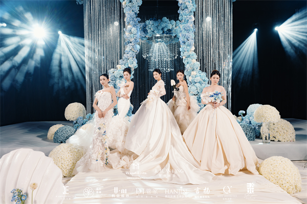 婚礼秀的重头戏——婚纱大秀为现场宾客呈现了多种风格的婚纱礼服系列。模特们身着缀满亮片与珍珠的鱼尾婚纱、轻盈飘逸的轻纱礼服,在光影流转的T台上缓缓走来,将浪漫、优雅与梦幻的婚礼氛围演绎得淋漓尽致。不同款式的婚纱满足了新人对婚礼的多元想象。搭配现场的蓝调灯光与花艺背景,每一套造型都成为了定格幸福的视觉符号,让在场宾客提前感受婚礼当天的高光时刻。