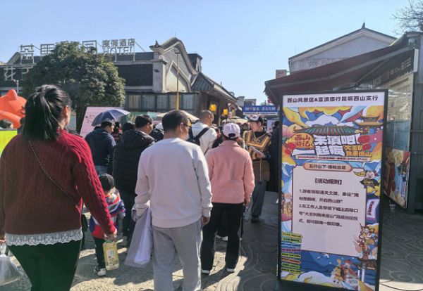 春节期间,富滇银行昆明西山支行联动西山风景区,积极参与“西山游记・来滇吧!一起疯”沉浸式新春主题活动,将便民金融服务、惠民活动与新春文旅场景深度融合,在强化金融消费者权益保护宣传的同时,为广大市民与游客带来安全、暖心、有特色的新春体验。